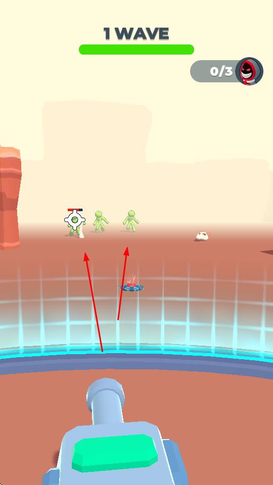 3、进入战斗模式,使用升级武器射击外星怪物(1WAVE),守护基地,完成波次挑战,推进关卡。