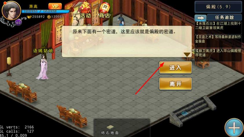 1、在对应场景界面,找到进入密道相关交互点,如偏殿处点击【进入】,开启暗卫任务相关密道探索环节。