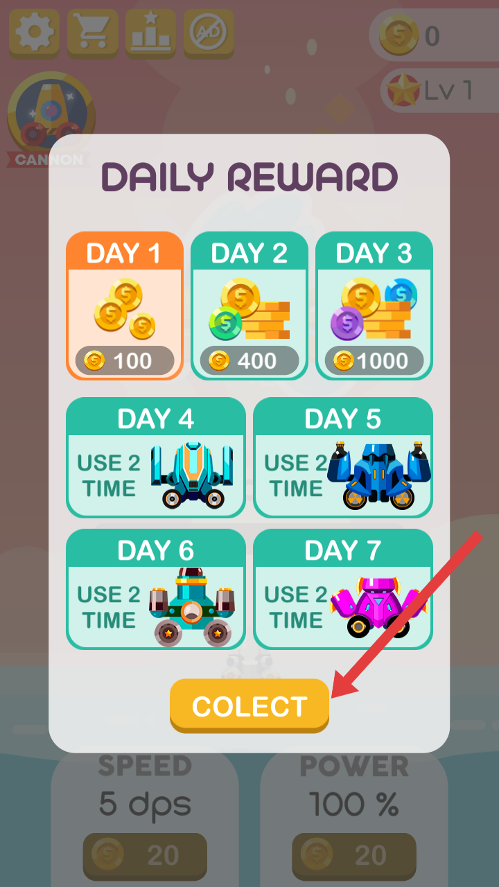 1、进入每日奖励界面,点击【COLLECT】领取当日奖励,积累金币与机甲道具,助力游戏进程。