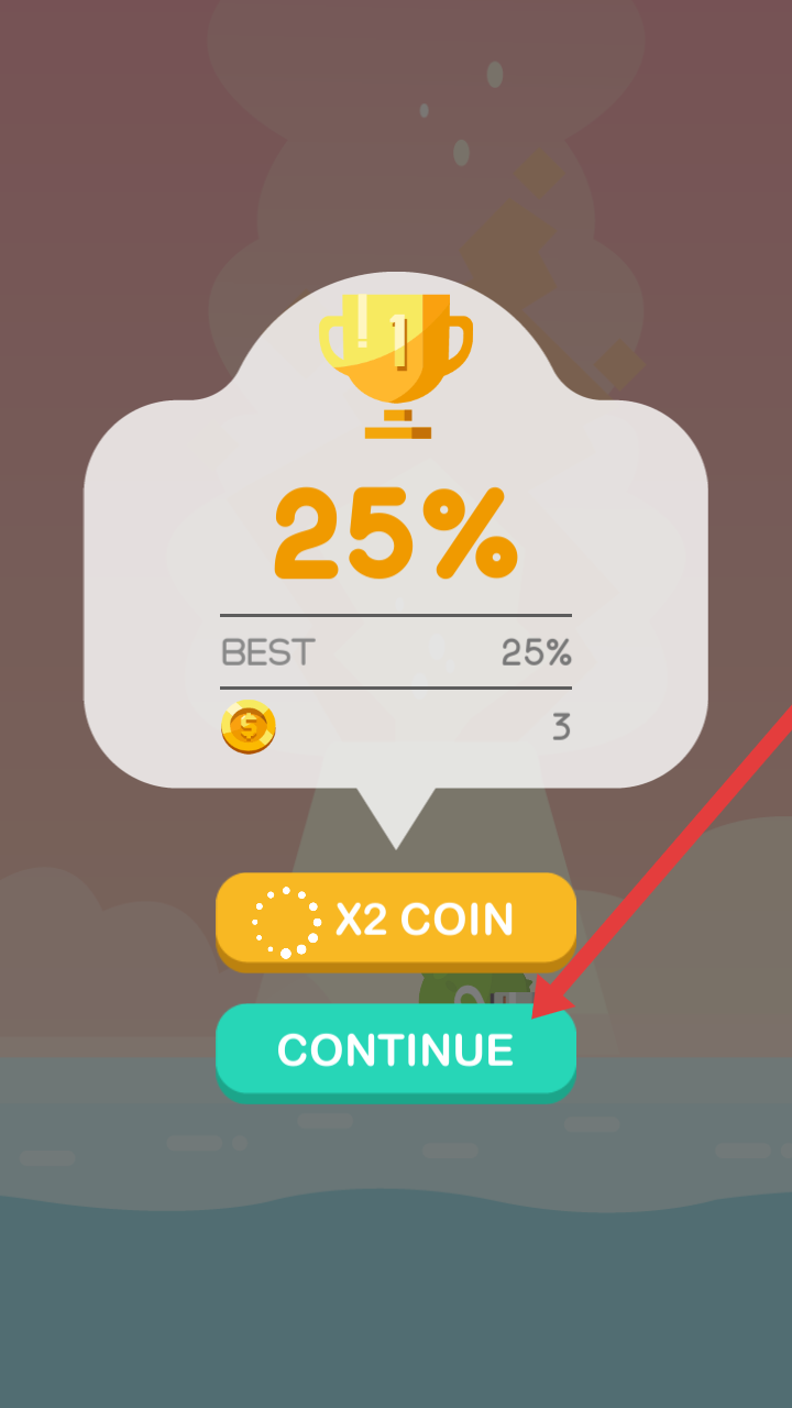 3、挑战结束后,可点击【CONTINUE】继续游戏,或选择【X2COIN】看广告翻倍金币,积累资源。