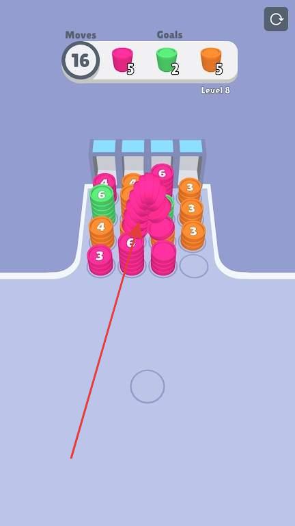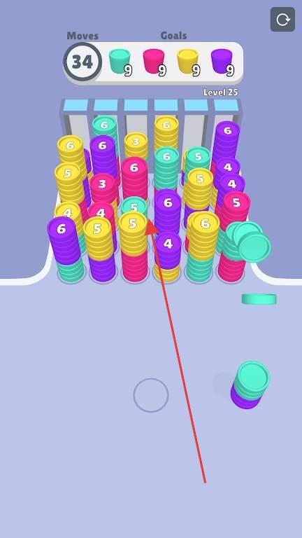 1、进入游戏后,观察屏幕上的圆牌颜色与位置,轻点屏幕移动圆牌,让其落到对应颜色的堆叠处,开启消除之旅。