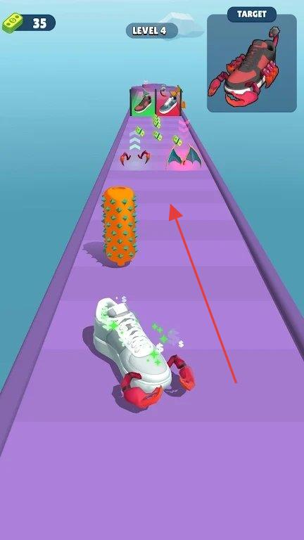 1、进入初始赛道,滑动屏幕让怪物鞋左右移动,跳过首个障碍物,拾取第一枚进化buff(如增加鞋码),完成首次进化,熟悉移动、跳跃与进化的基础操作。