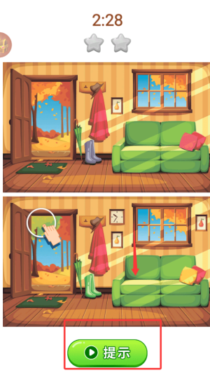 2、通过点击屏幕两侧图片比对寻找差异,每张图设有5处不同点等待发现。