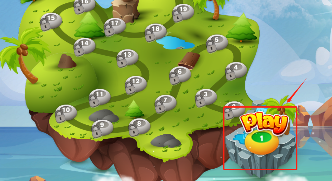 1、看到右下角带数字1的Play按钮,用手指点它,就能从第1关开始玩绿色岛屿闯关游戏啦。