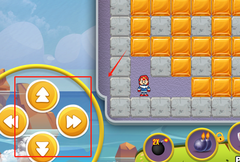 3、看到左下角红框里的四个方向箭头,按对应方向键,就能控制小人走到终点,炸弹能帮你开路哦。