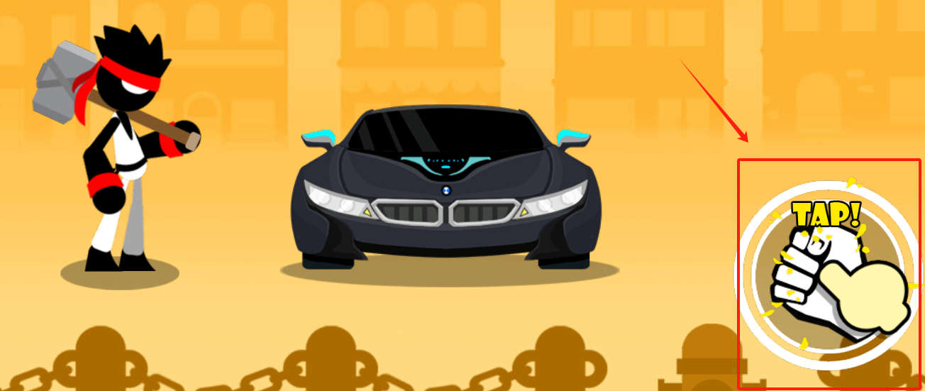 1、看到火柴人旁边TAP拳头图标,用手指点它,就能让火柴人挥锤砸车开始游戏啦。