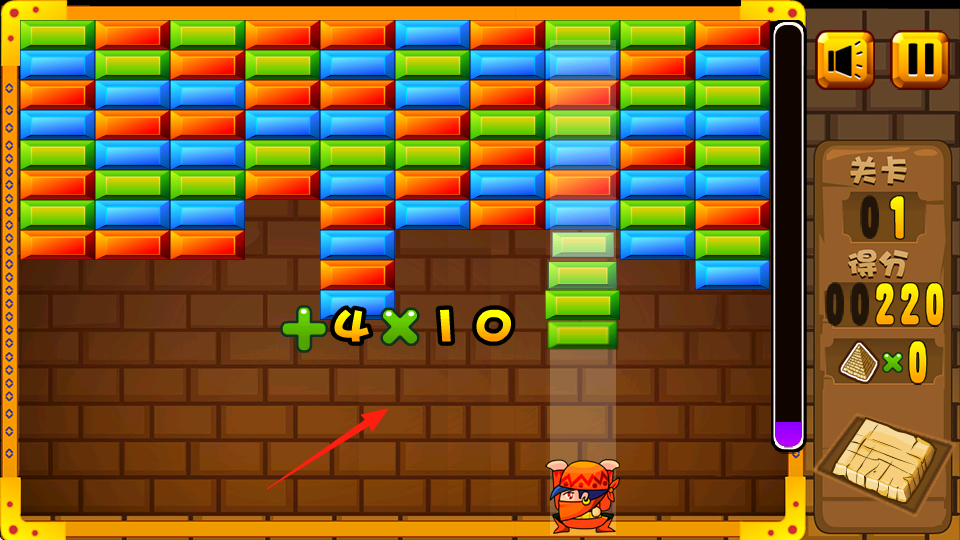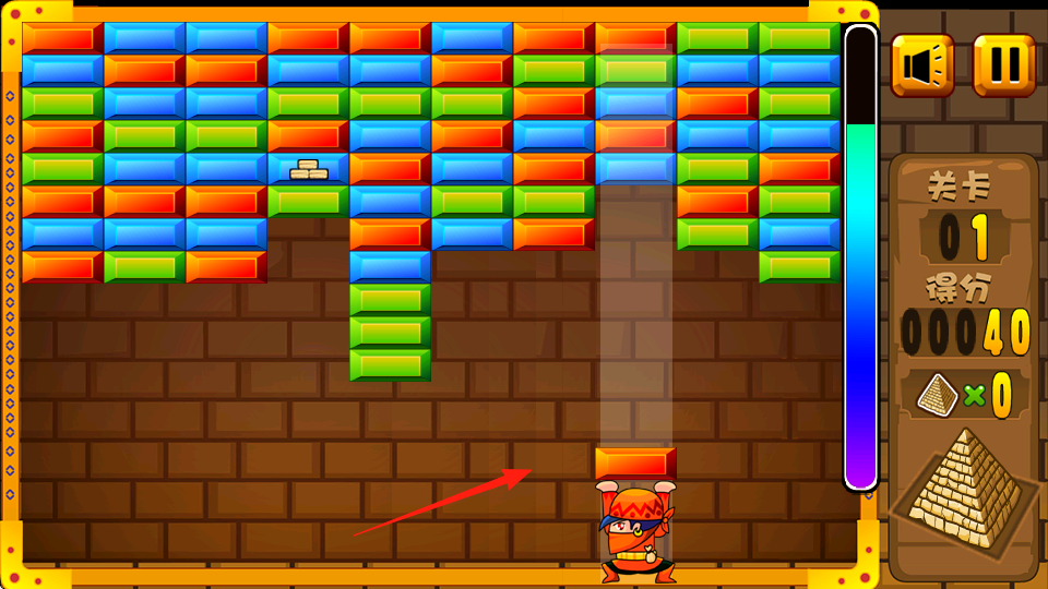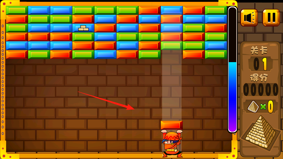 1、控制角色发射方块,撞击同色砖块使其消除,优先消底层助力上层砖块下落。