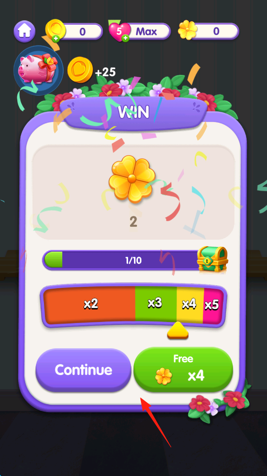 1、按指引点击花盆,完成操作后在结算界面选“Continue”,继续解锁新花卉关卡。