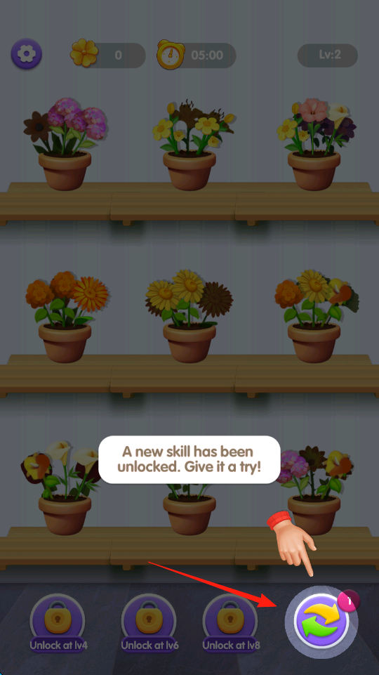 3、点击指定花盆参与培育,赢取花朵奖励提升等级,解锁新技能后尝试使用新功能。