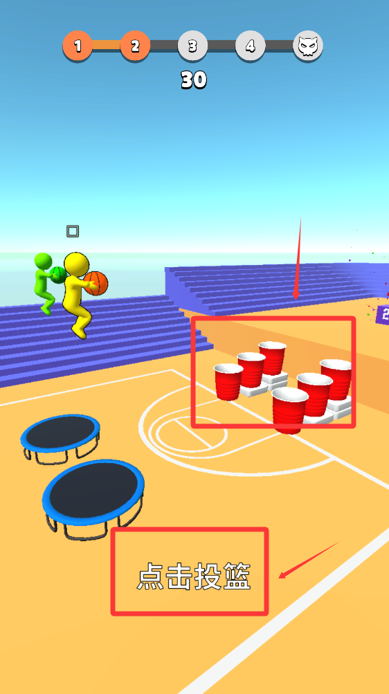 1、点击一下屏幕就投篮,需要投进红色的桶子里面。