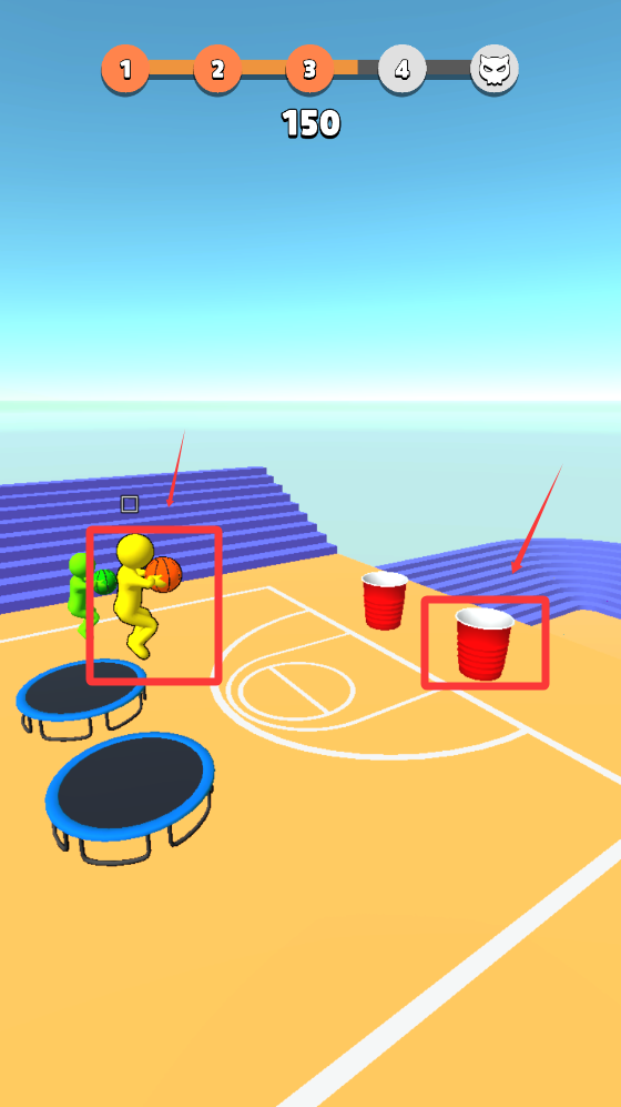 2、当他弹跳起来的时候水平线跟红色的桶一样就点击一下就能进球了。