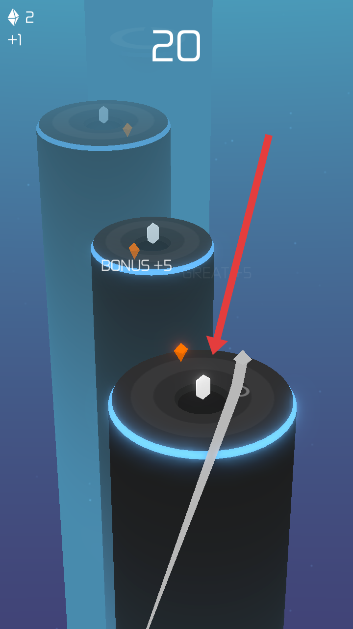 2、游戏中操控圆柱旋转,让白色长条精准收集橙色菱形、白色六边形道具,触发【BONUS+5】等加成。
