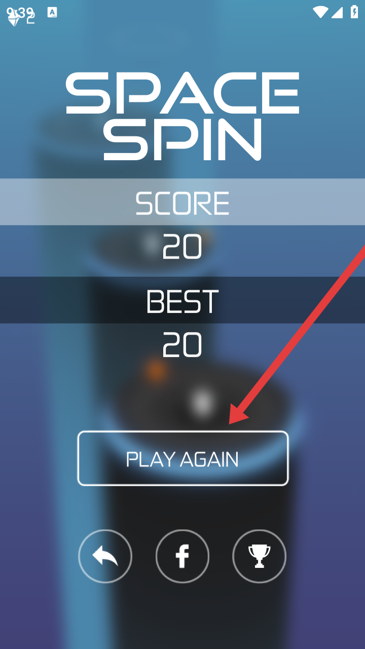 3、在结算界面显示分数与最佳成绩,点击【PLAY AGAIN】按钮,重新开始游戏,冲击更高的记录。