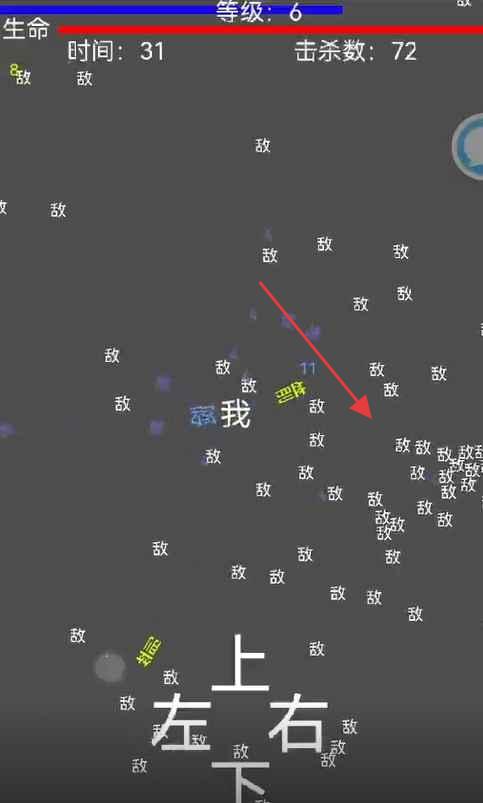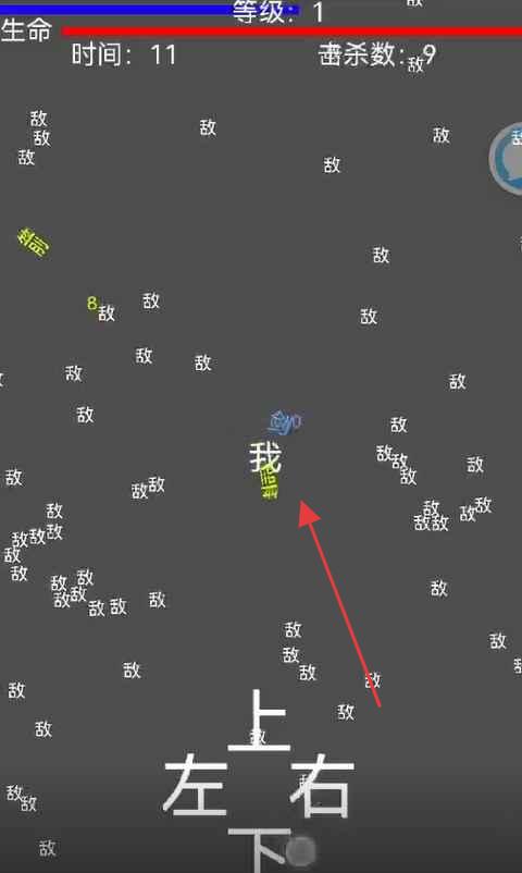 1、进入战斗界面,操控“我”在文字敌人中移动,躲避“敌”字,攻击求生,积累击杀数,提升等级。