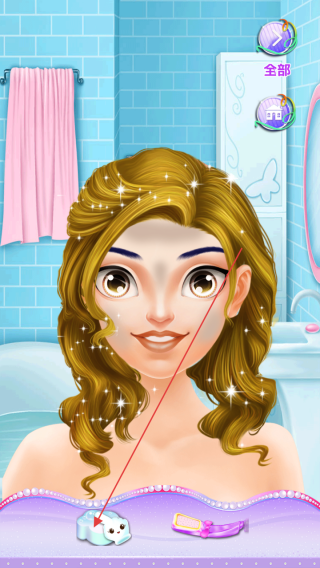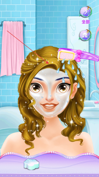 2、切换到美容场景,点击洗浴用品(如卡通造型肥皂),为公主清洁、护理头发皮肤。
