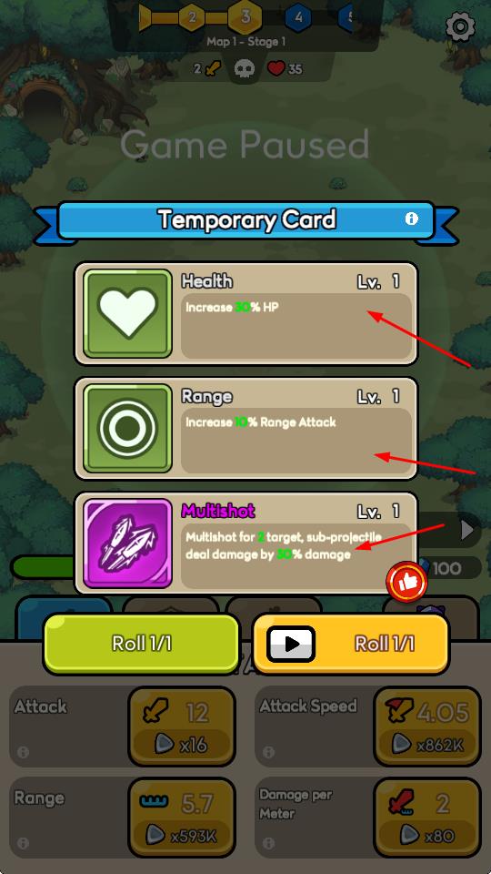 2、战斗中获取临时卡牌(TemporaryCard),选择Health、Range、Multishot等增益,提升角色战力。