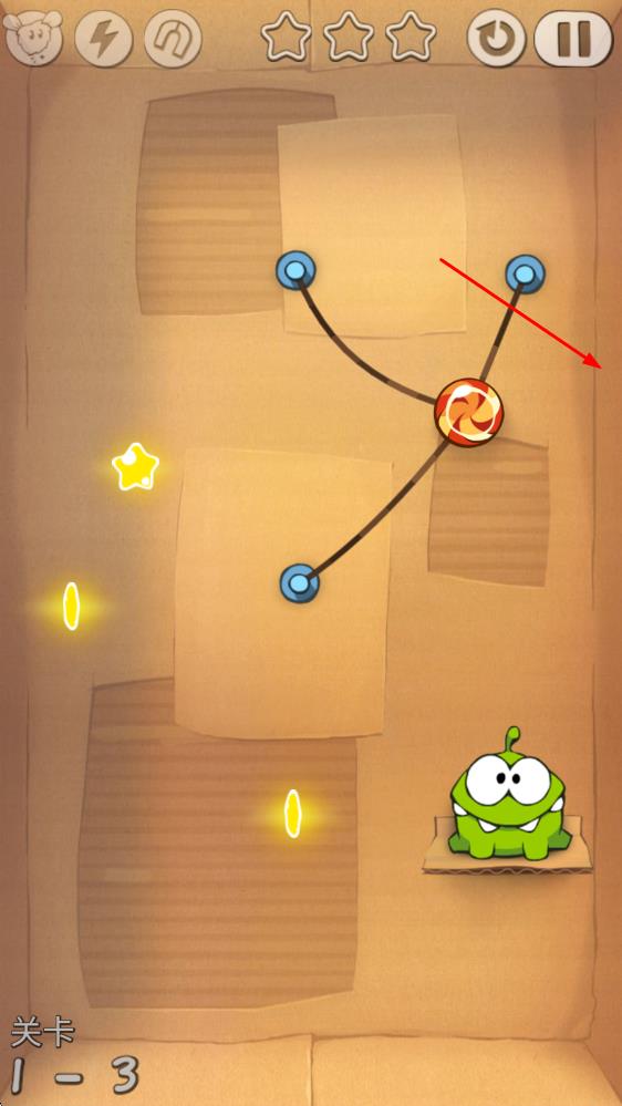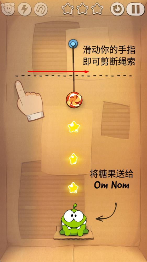 1、进入游戏后,观察糖果悬挂的绳子布局与小恐龙位置,熟悉切割操作,准备通过切断绳子让糖果顺利滚落至小恐龙口中。