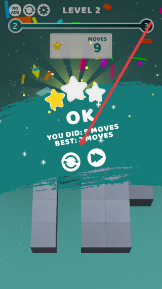 3、关卡2结算页,点击箭头指向按钮,确认9步通关成绩,继续挑战后续关卡,提升滚动技巧。