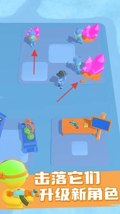 1、操控矿工开采粉色晶体,积累资源,点击“击落它们 升级新角色”解锁更强矿工。