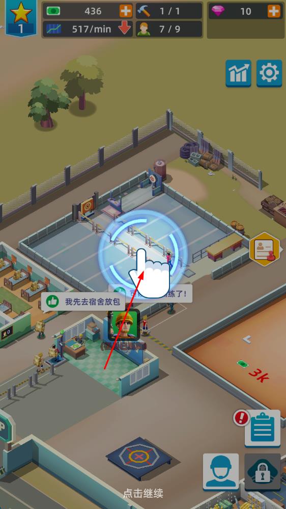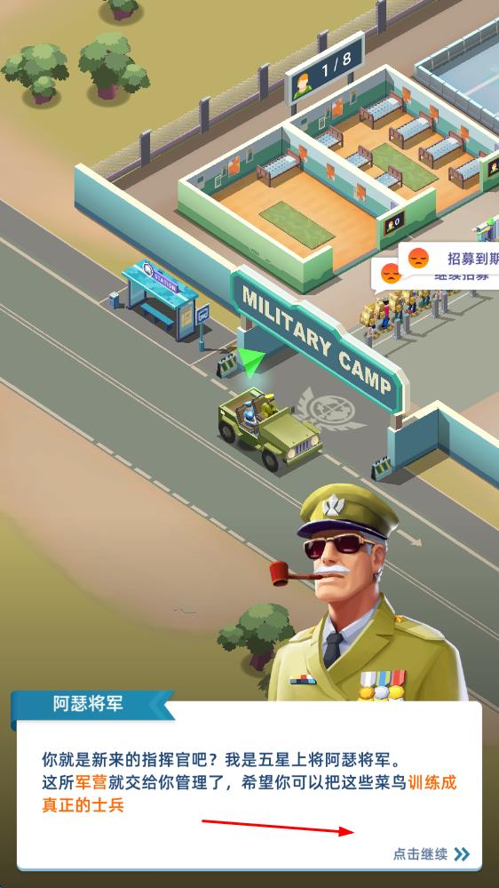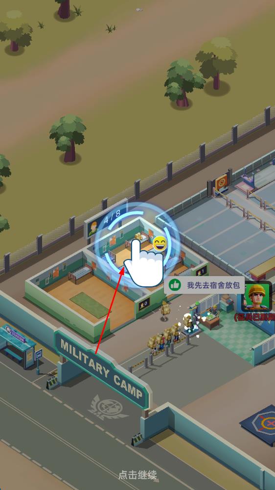 1、进入游戏后,先从招募平民开始,为他们规划基础训练课程,建造兵营提供住宿,解锁射击、障碍等训练场,开启新兵的蜕变之旅。