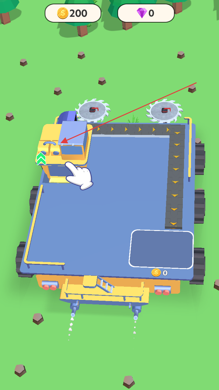 1、操控伐木车,点击指引部位启动,利用锯片开展木材采集,开启生产流程。