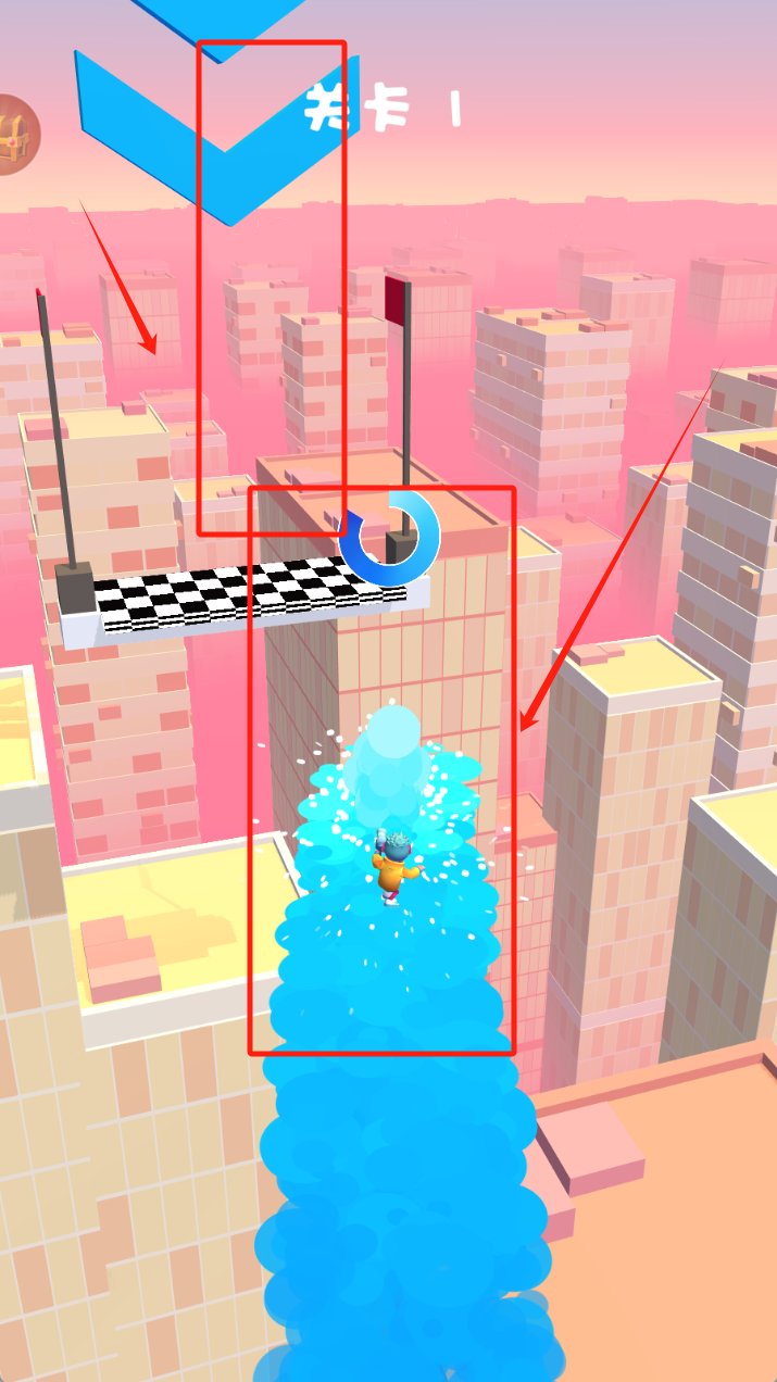 2、操控角色在蓝色水流路径上前进,注意上方关卡1提示,避开障碍物,收集沿途道具,背景是粉色城市景观。