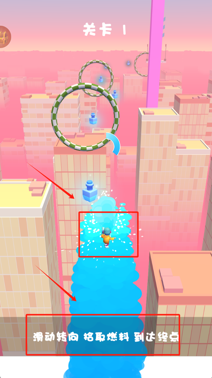 3、滑动屏幕控制角色转向,收集绿色圆环内的蓝色燃料,沿着水流路径前进到达终点,注意上方关卡1进度提示。