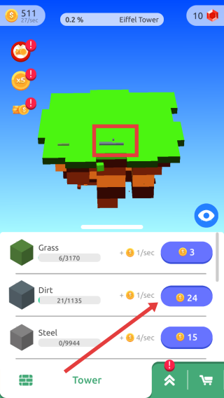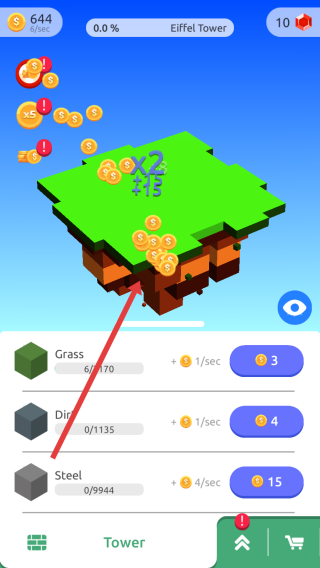 1、初始界面点击金币掉落区域(箭头指向),快速收集金币,用于解锁/升级资源(如Grass、Dirt),推进“Eiffel-Tower”建造。