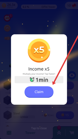 3、弹出“Income-x5”界面时,点击【Claim】(箭头指向),获取1分钟金币收益翻倍效果,快速积累财富,升级更多资源。