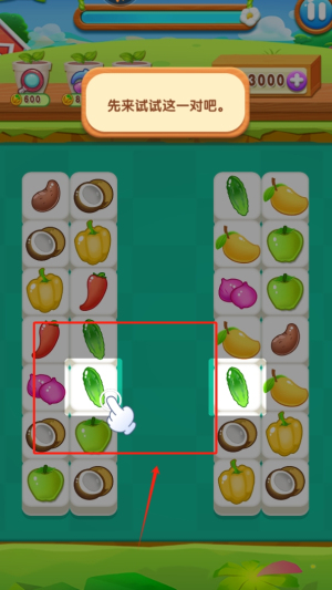 3、经典水果主题消除玩法,将相同图案的果蔬卡片两两连接,路径转折不超过两次即可成功消除。