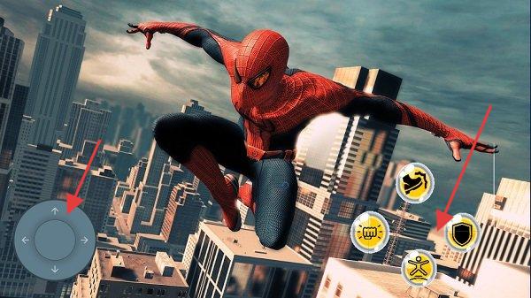 1、在城市穿梭界面,用左侧摇杆控制移动,右侧技能键(如盾牌)应对突发危险,熟悉蜘蛛侠跑酷与战斗基础操作。