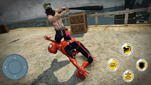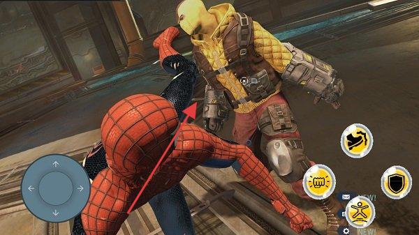 2、战斗时,操控蜘蛛侠近身攻击敌人(如黄衣匪徒),合理衔接技能,利用闪避(盾牌键)躲伤害,保持战斗优势。