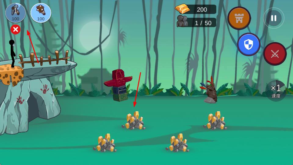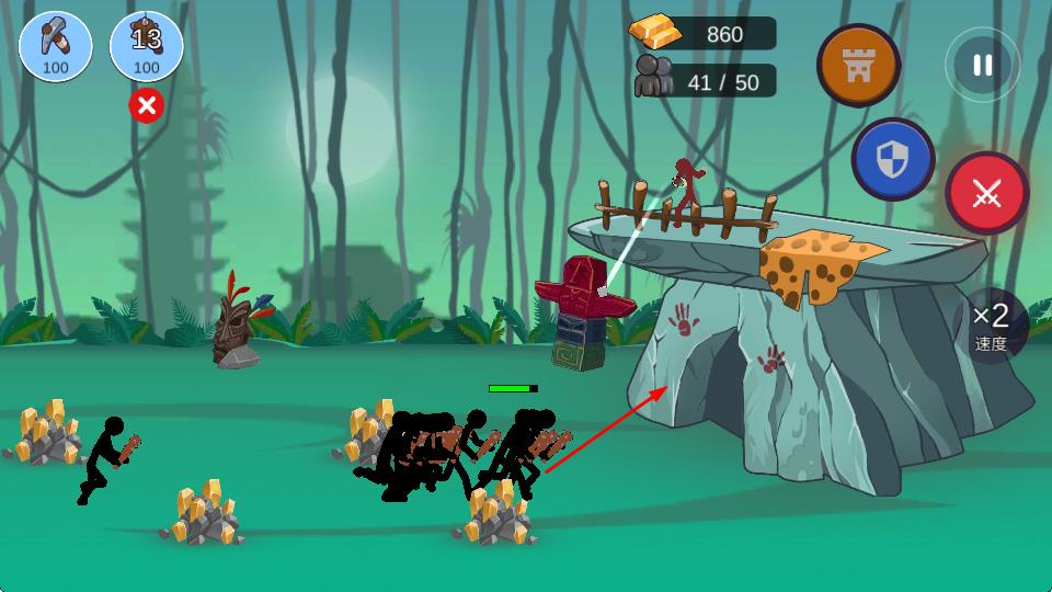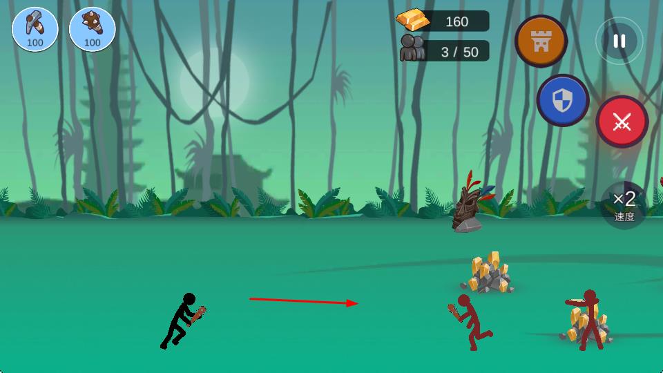 3、指挥战斗火柴人部队,主动出击,进攻敌方建筑(洞穴等),击败敌方单位,获取战斗胜利。