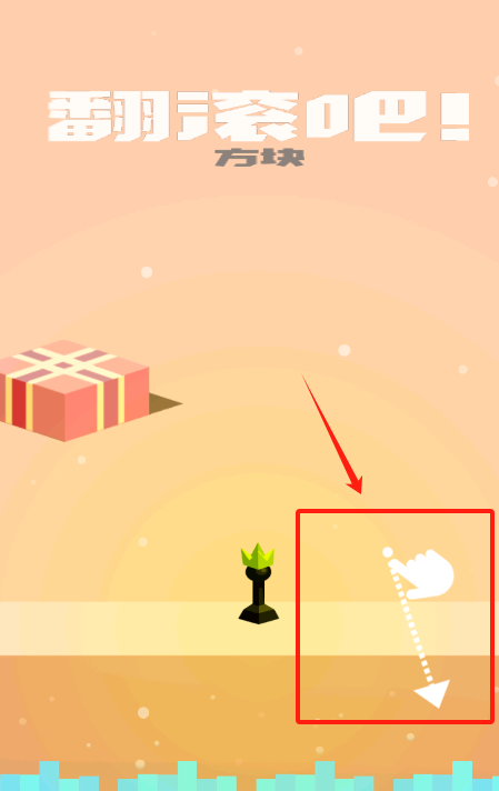 1、看粉色背景白色大字翻滚吧方块,按红色框内手指图标提示,点击下方黑绿物件开始游戏。