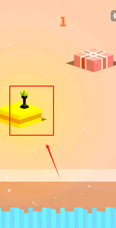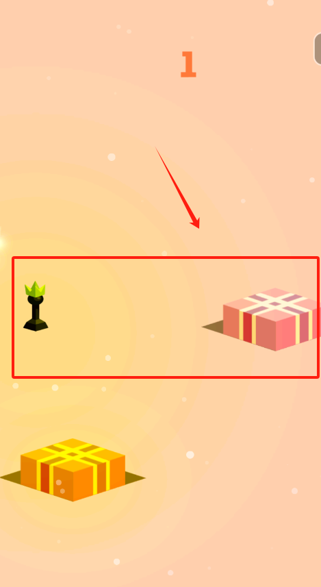 3、看红色数字1和箭头指向的红框区域,点击框内黑绿物件和粉色礼盒,完成跳跃操作。