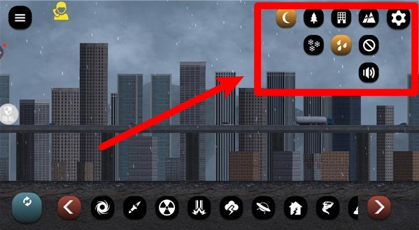 1.右上方的环境设定按钮可调整游戏中的天气、时间与音效状态,提供夜晚、下雪、雨天等模式自由切换,体验感更真实。