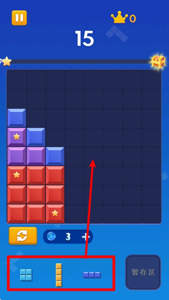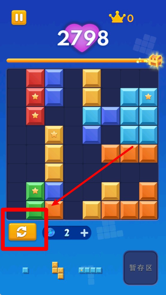 2.刷新方块按钮:左下角橙色循环图标可用于刷新当前三个待放方块,适用于遇到难以摆放的组合时进行调整以延续游戏。