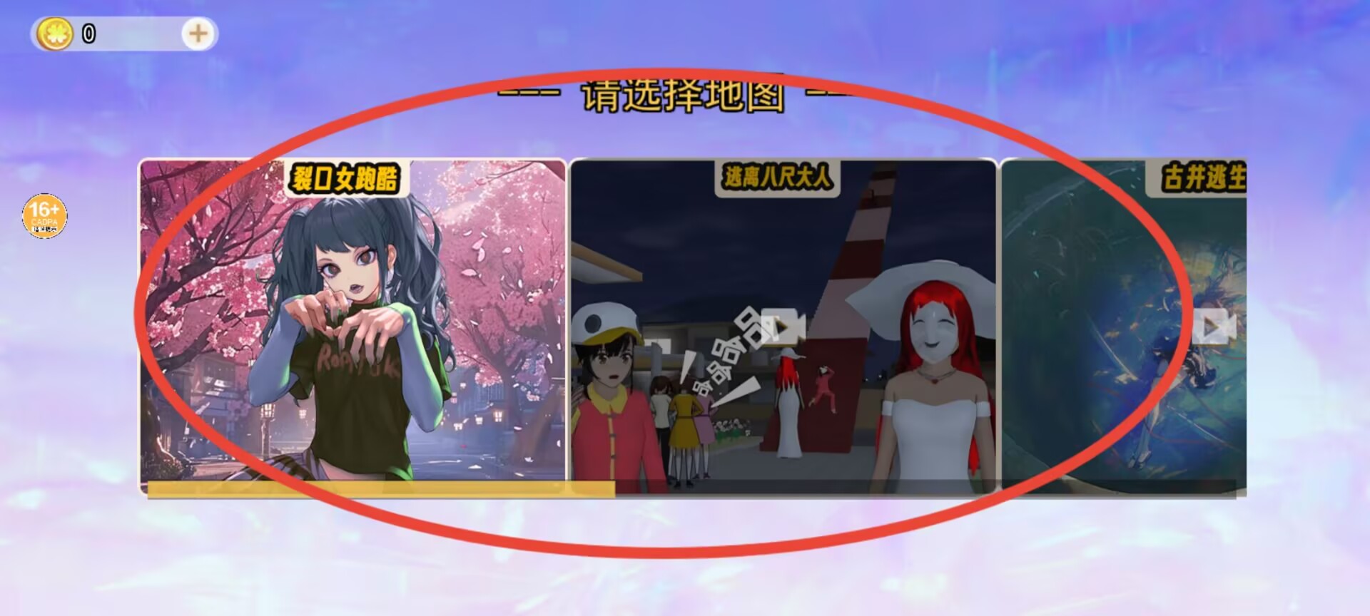 2、游戏主界面提供多个主题地图,包括裂口女追击、八尺大人逃脱等不同场景可供选择。