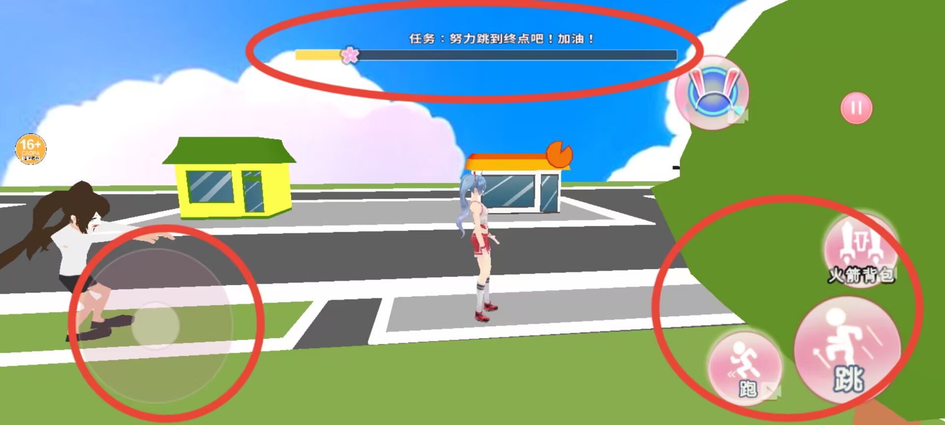 3、进入游戏后,顶部区域显示当前任务进度,底部左右两侧分别为移动控制与跳跃奔跑功能按键。