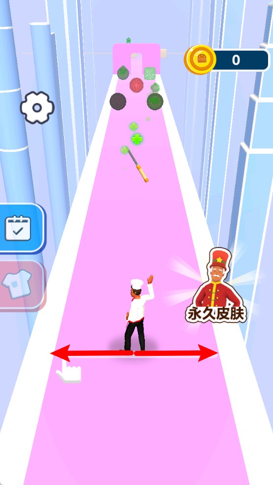 1.玩家通过滑动屏幕控制大厨角色,在跑酷赛道上收集散落的食材,同时避开障碍物,确保食材收集顺利进行。