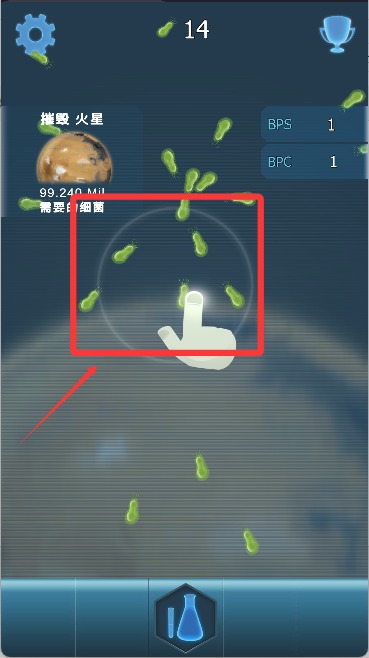 1、通过点击培养按钮提升细菌产量,当菌落规模达到一定阈值后即可解锁新星球,以此循环推进侵略进程。
