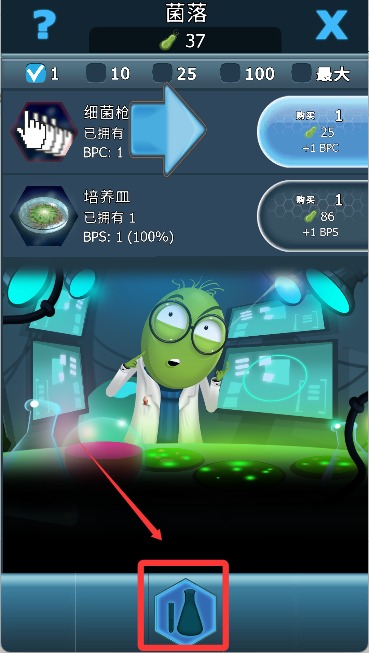3、点击下方的按键可以购买细菌枪和培养皿帮助加速繁殖。