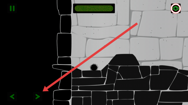 2、在游戏内点击左下角绿色箭头按钮(如右箭头),操控黑色小球在石质场景中移动,探索路径。