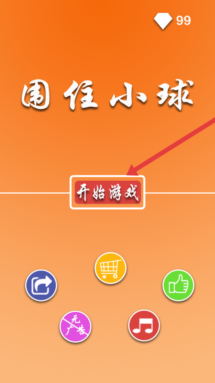 1、进入围住小球的游戏界面,需要点击箭头指向的【开始游戏】的按钮,进入关卡1开启挑战。