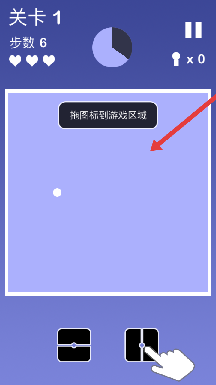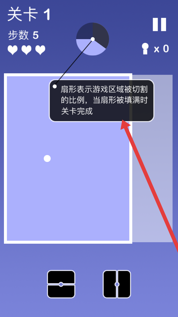 3、关注上方扇形进度,其代表游戏区域切割比例,通过放置图标填满扇形,达成关卡1的通关条件。