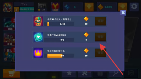 1、在任务界面,完成“击败4个敌人”“观看广告”等任务,点击箭头指向的【领取】,获取钻石、道具奖励。
