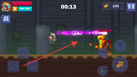 3、对战Boss(箭头指向),灵活走位躲避攻击,利用武器射击(紫色光束),消耗Boss血量,争取胜利。