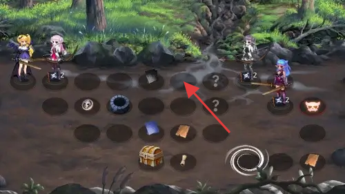 2、进入森林探索场景,点击箭头指向的问号区域,触发随机事件(如宝箱、敌人),获取资源或战斗。