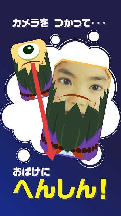 1、在拍照界面,按照“カメラを-つかって(使用相机)”的提示,使用相机拍摄面部,生成带有达摩形象的效果,然后点击箭头指向位置继续。
