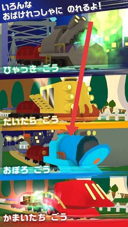 2、在火车选择界面,根据箭头指向,选择下方的蓝色火车(おぼろ-こう(胧号)),进入相关游戏环节。